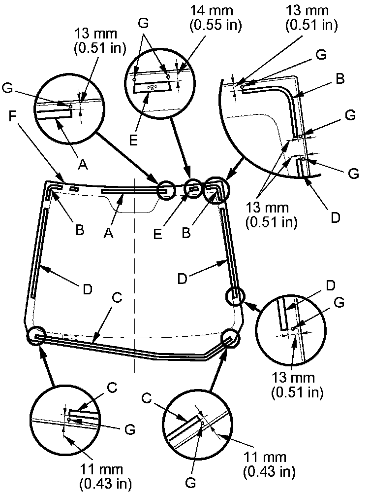 - Apply glass primer to the bottom (E) of the windshield, using the printed dots (D) on the windshield as a guide.