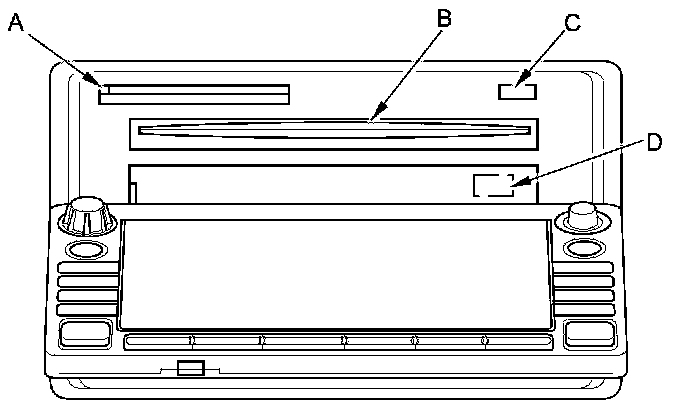 7. Press the CD eject button (C), and navigation DVD eject button (D) and remove the discs (hold the discs by their edges to avoid fingerprints). To avoid scratches, place the navigation DVD and the customer's CD in a jewel case if available.