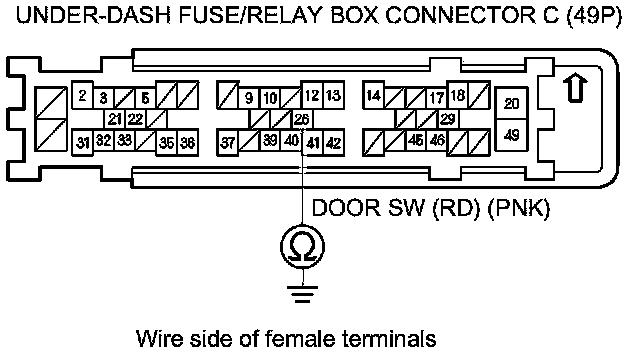 8. Check for continuity between under-dash fuse/relay box connector C (49P) terminal No. 26 and body ground.