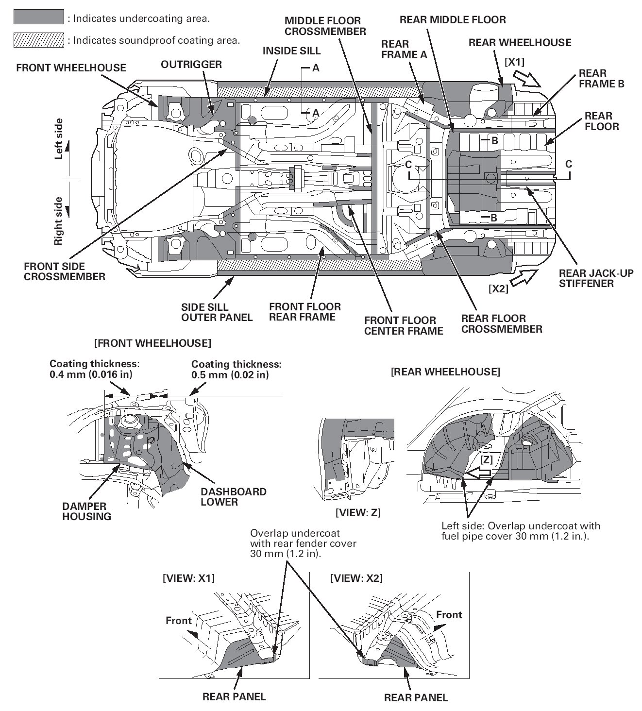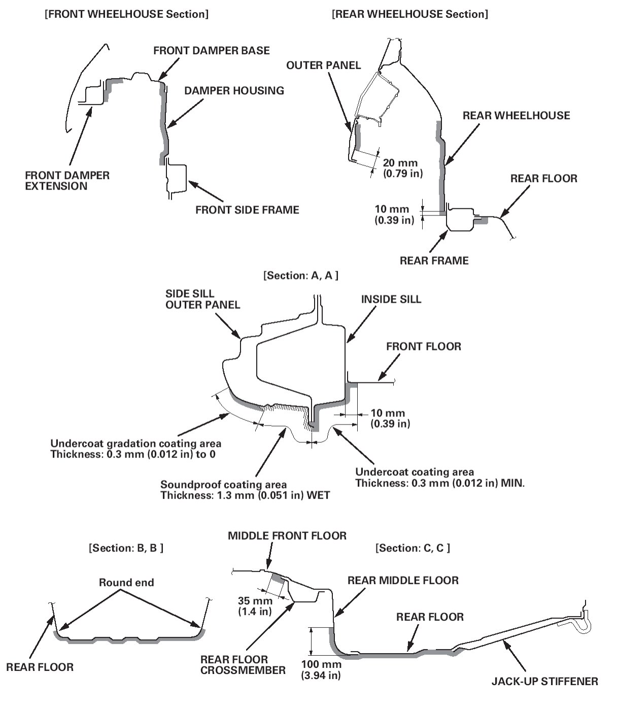 - Front wheelhouse, rear wheelhouse, and dashboard lower coating thickness 0.5 mm (0.02 in).