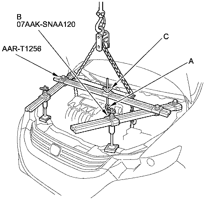 8. Install the engine support hanger (AAR-T1256), then attach the hook (A) to the slotted hole in the second universal lifting eyelet (B). Tighten the wing nut (C) by hand to lift and support the engine/IMA motor/transmission.