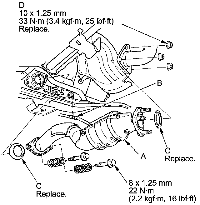 NOTE: Use new gaskets (C) and new self-locking nuts (D).