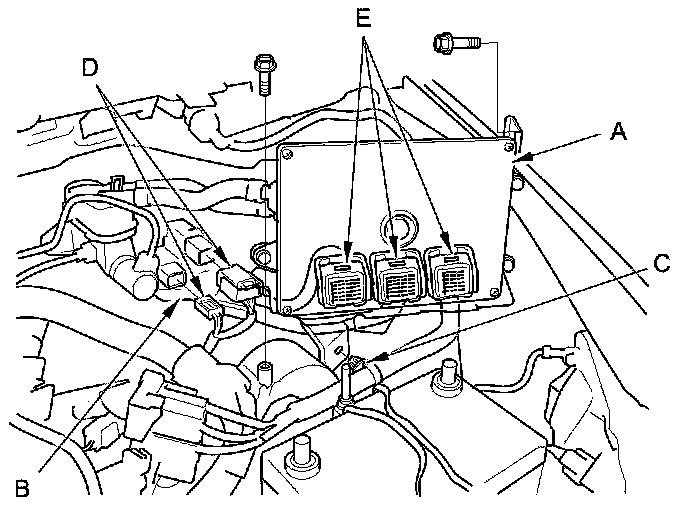 47. Connect the engine wire harness connectors (D) and the PCM connectors (E).