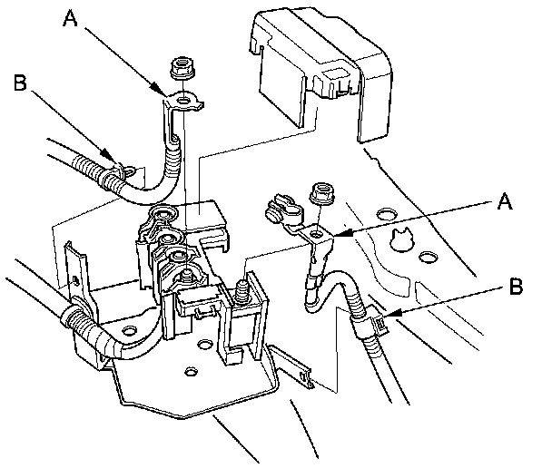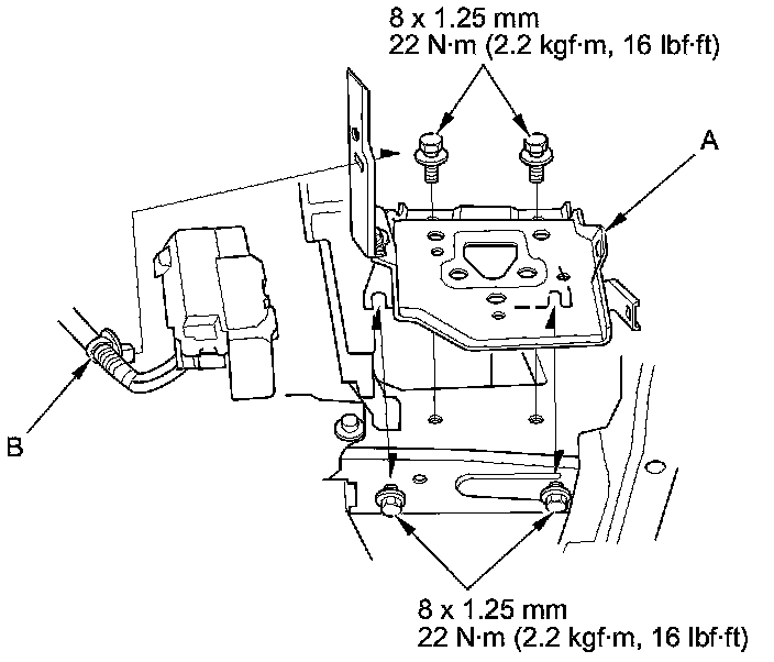2. Install the side engine mount/bracket assembly (A), then tighten the new side engine mount/bracket assembly mounting bolts (B).