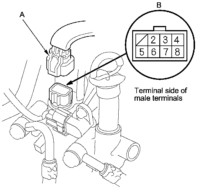 3. Measure the CVT drive pulley pressure control solenoid valve resistance between solenoid wire harness connector (B) terminals No. 3 and No. 7.
