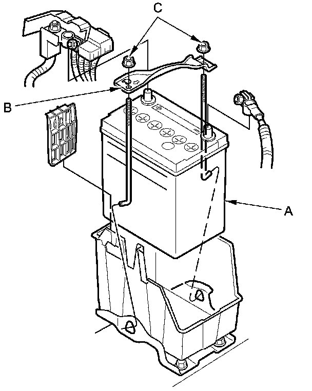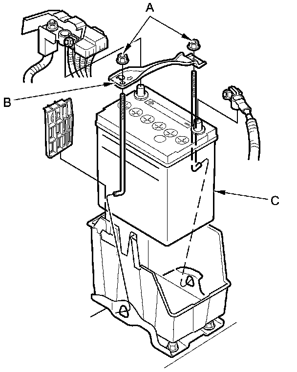 2. Remove the two nuts (A) securing the battery hold down plate (B), then remove the battery setting plate and the battery (C).