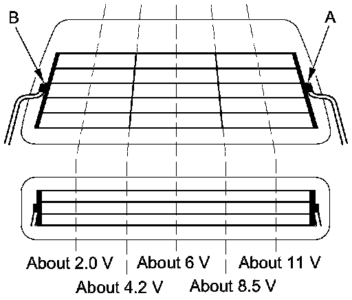 3. Measure the voltage between the negative terminal (B) and body ground. There should be less than 0.2 V.
