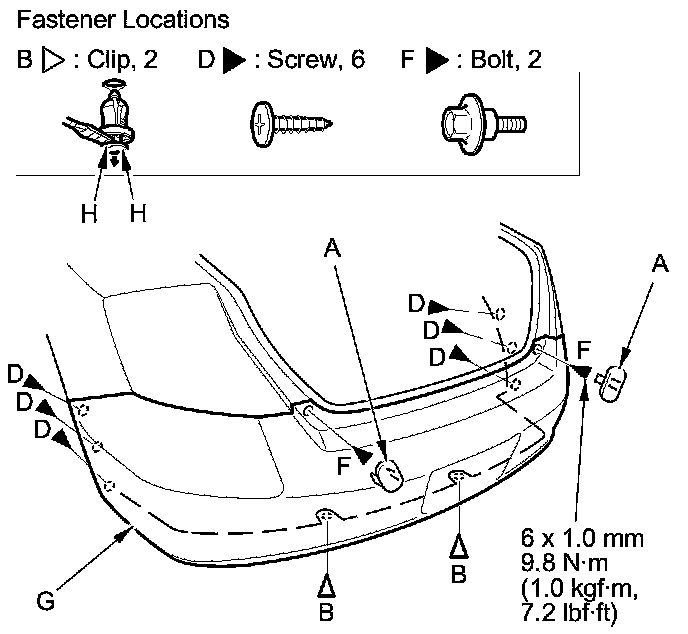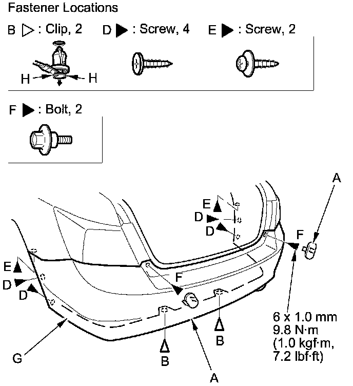 1. Remove the caps (A). Remove the clips (B, C), the screws (D, E), and the bolts (F) securing the rear bumper (G).
