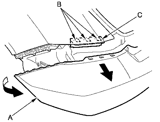 3. With the help of an assistant, pull out one side of the rear bumper (A) to release the hooks (B) on the side bracket (C) as shown. Repeat this step on the opposite side.