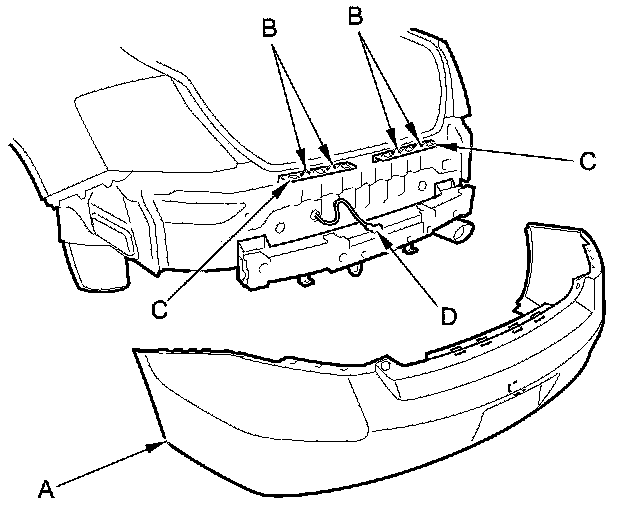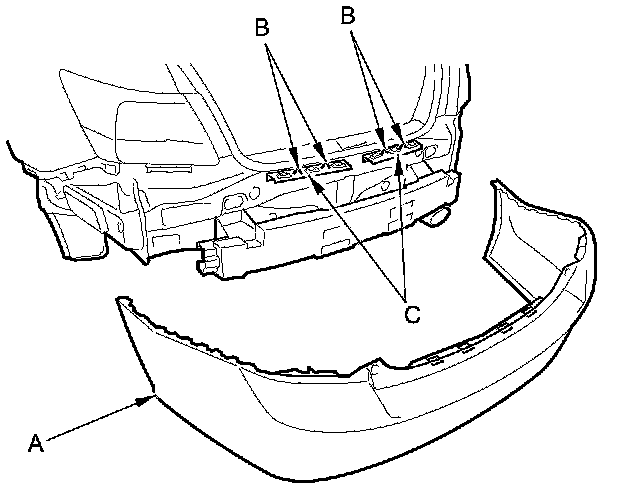 5. If necessary, remove the rear bumper absorber (A) from the rear bumper beam (B) by pulling the absorber to release the post (C) on both sides.