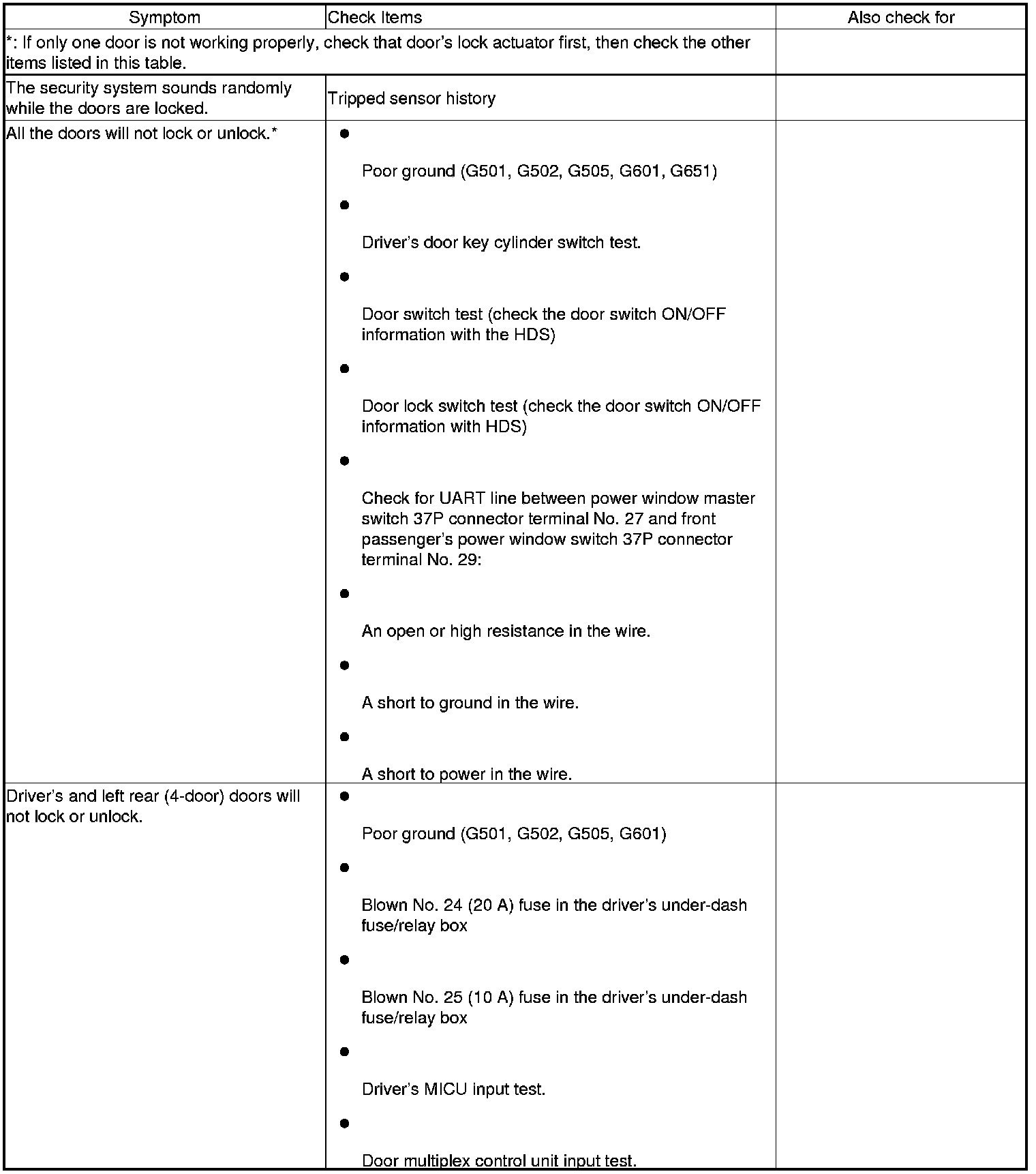 Keyless/Power Door Locks/Security System Symptom Troubleshooting Index