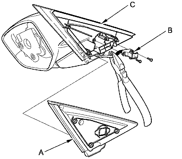 2. Remove the gasket (A), then remove the screw and power mirror 8P connector (B) from the mirror (C).