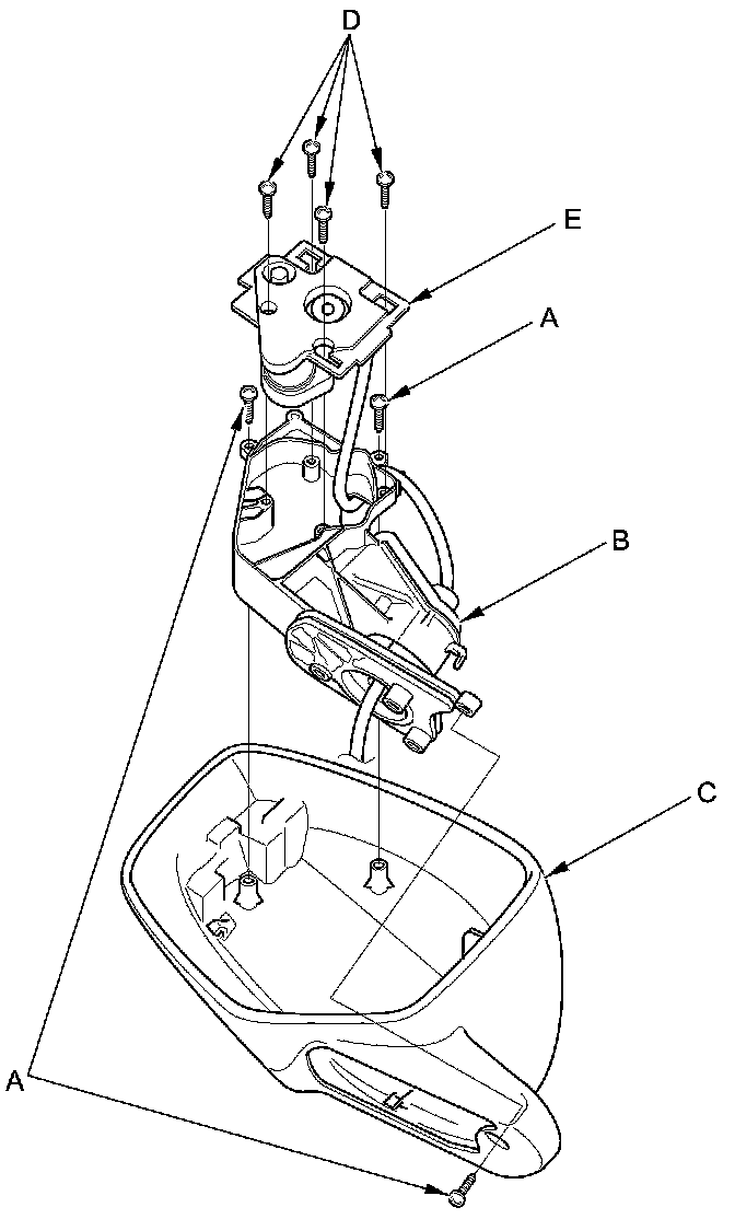 5. Remove the three screws, and separate the mirror housing (B) from the bracket (C).