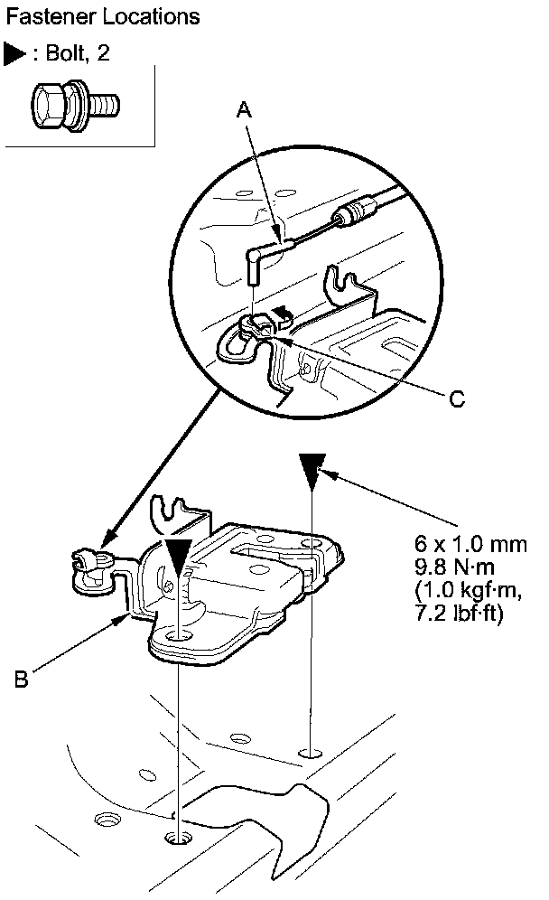 2. Disconnect the seat-back release cable (A) from the seat-back latch (B), and remove the bolts, then remove the latch. Take care not to damage the cable fastener (C).