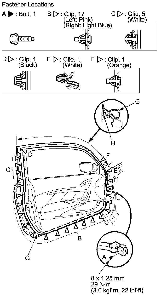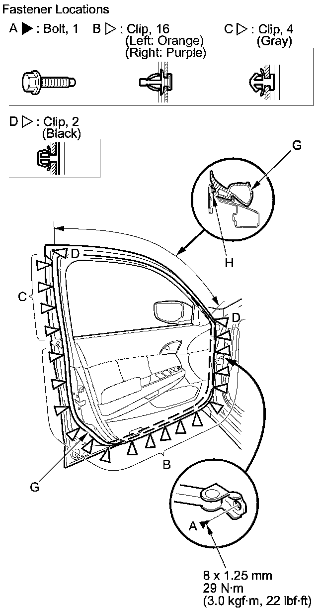 2. Detach the clips (B, C, D, E, F), and release the door weatherstrip (G) from the holder (H) of the door sash, then remove the weatherstrip.