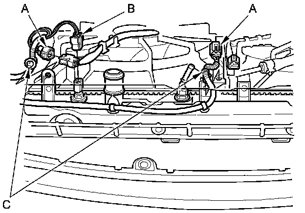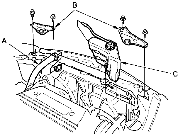 10. Disconnect the upper radiator hose (A) and remove the upper brackets (B) and the coolant reservoir (C).