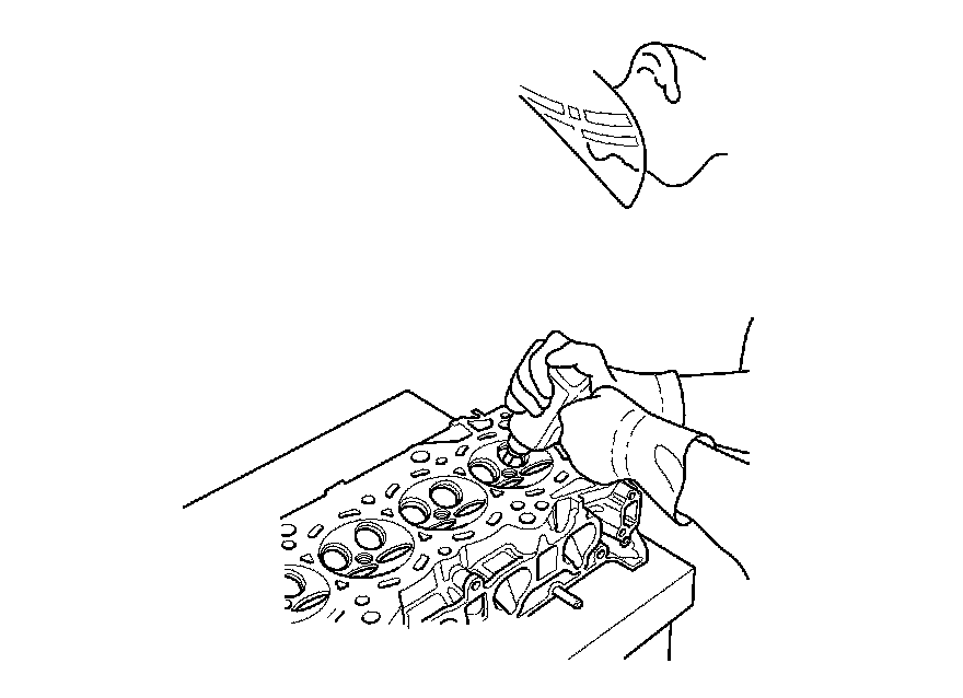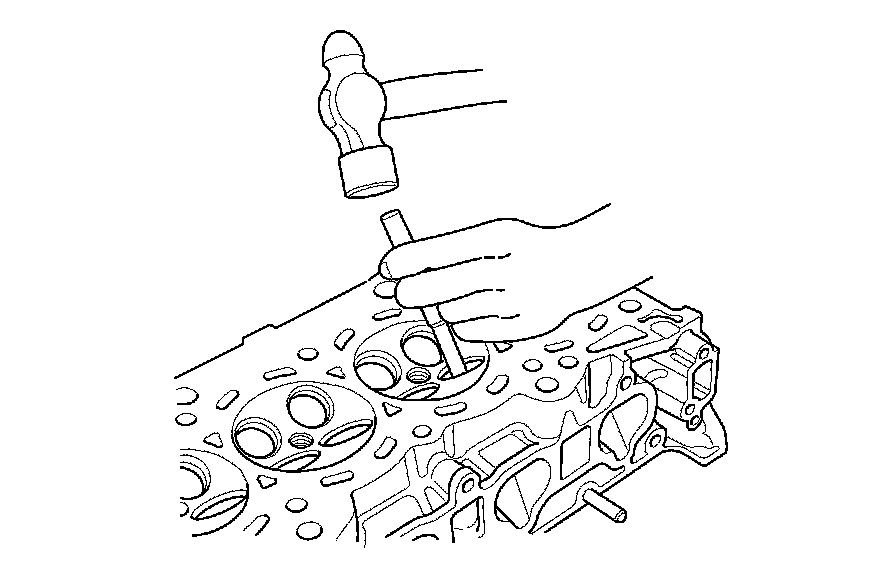 5. Working from the camshaft side, use the driver and an air hammer to drive the guide about 2 mm (0.08 in) towards the combustion chamber. This will knock off some of the carbon and make removal easier. Hold the air hammer directly in line with the valve guide to prevent damaging the driver. Wear safety goggles or a face shield.