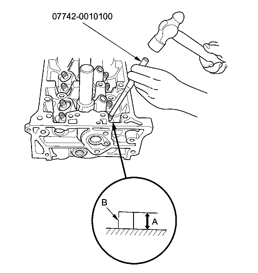 9. Apply a thin coat of new engine oil to the outside of the new valve guide. Install the guide from the camshaft side of the head; use the valve guide driver to drive the guide in to the specified installed height (A) of the guide (B). If you have all 16 guides to do, you may have to reheat the head.