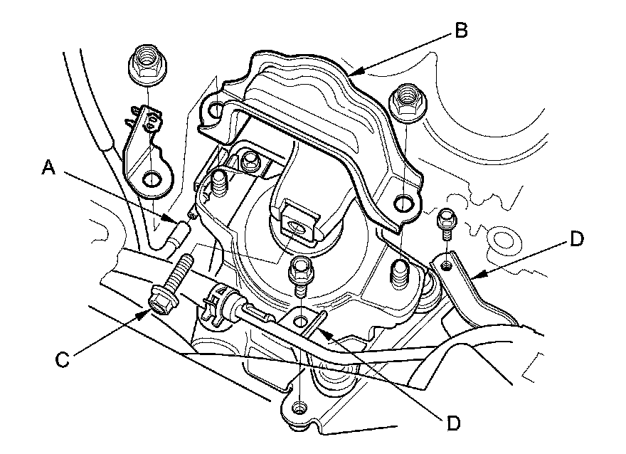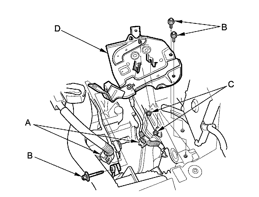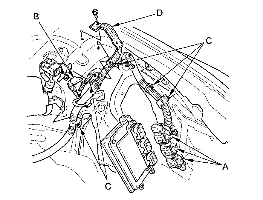 14. Remove the harness clamps (C) and the bracket (D).