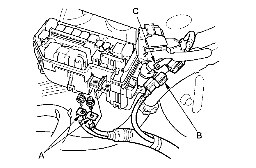 11. Disconnect the harness connector (B), and remove the harness connector from the bracket (C).