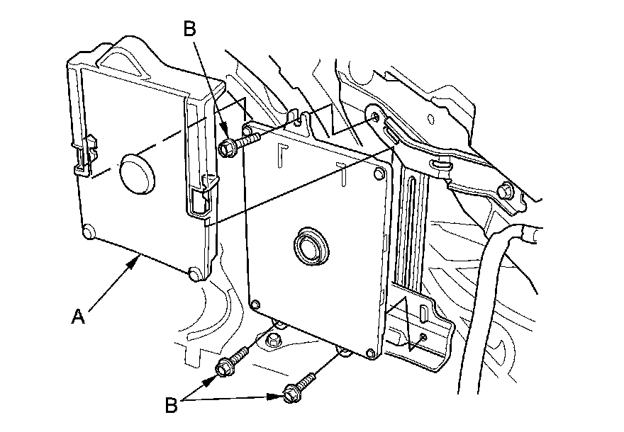 12. Remove the ECM/PCM cover (A), then remove the three bolts (B) securing the ECM/PCM.