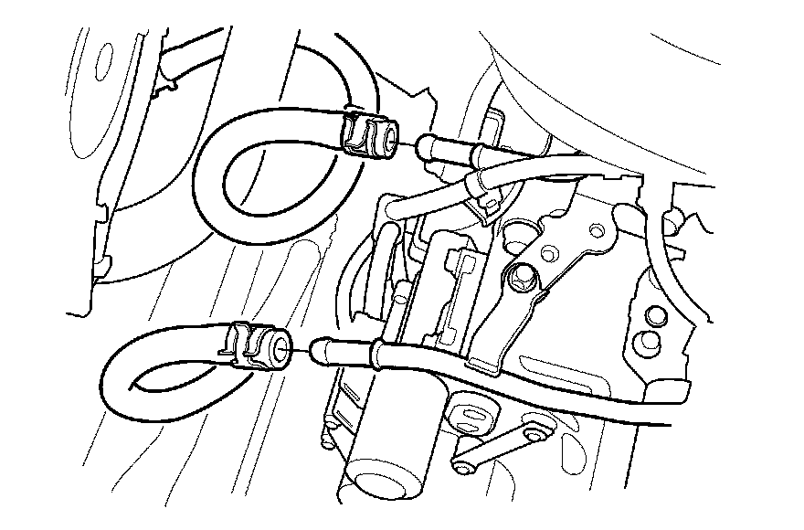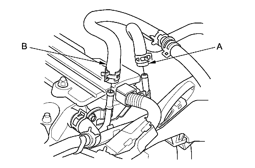 15. Disconnect the EVAP canister hose (A) and the brake booster vacuum hose (B).