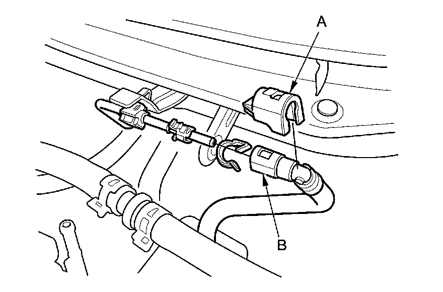 16. Remove the quick-connect fitting cover (A), then disconnect the fuel feed hose (B) Fuel Line/Quick-Connect Fitting Removal.