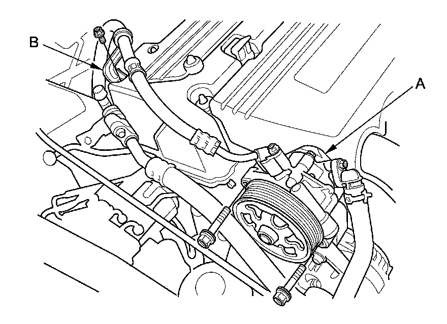 18. Remove the power steering pump (A) without disconnecting the power steering hoses, and the power steering hose bracket (B).