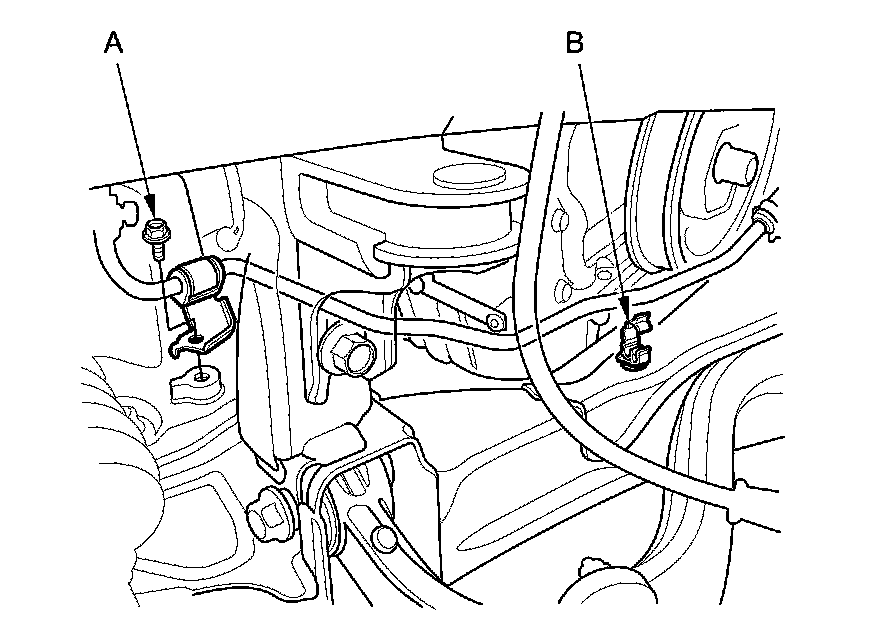 34. Remove the bolt (A) securing the power steering fluid line bracket, and unclamp the power steering fluid line clamp (B) on the front subframe.