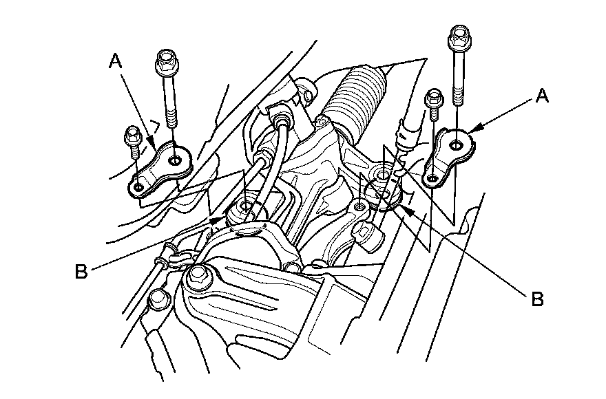 38. Remove the bolts securing the steering gearbox stiffeners (A) and the washers (B). (left side)