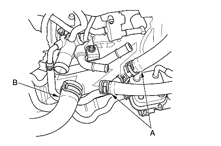 40. Disconnect the heater hoses (A) and the upper radiator hose (B).