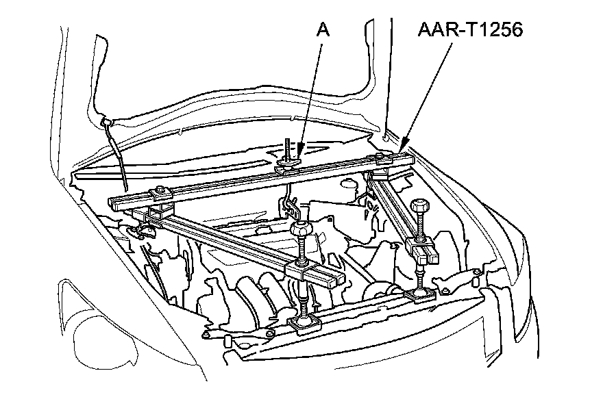 43. Install the engine support hanger (AAR-T1256) onto the vehicle as shown, and attach the hook to the slotted hole in the engine hanger adapter. Tighten the wing nut (A) by hand , and lift and support the engine/transmission.