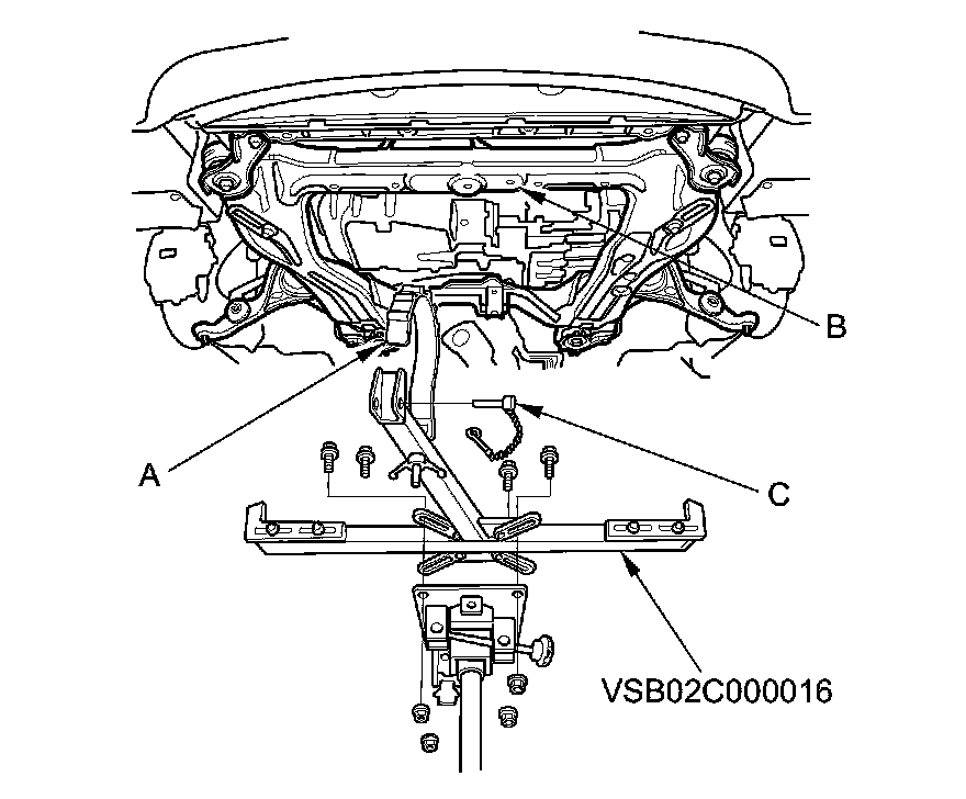 53. Attach the subframe adapter (VSB02C000016) to the front subframe by looping the belt (A) over the front of the front subframe (B), then secure the belt with its stop (C).