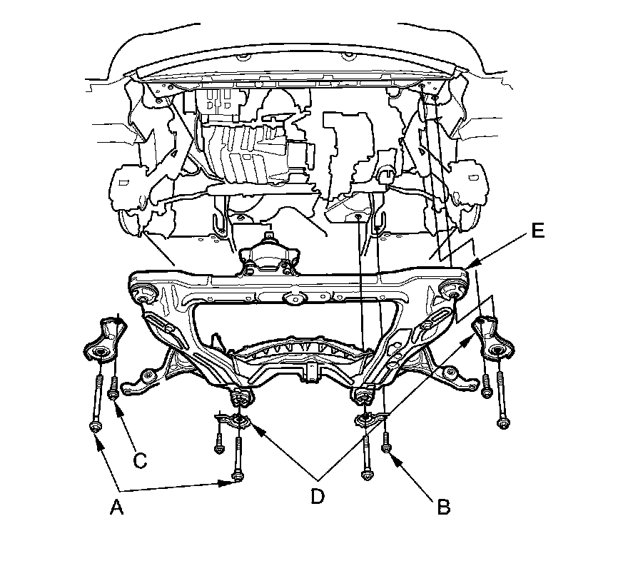 55. Remove the front subframe mounting bolts (A), the four 12 x 1.25 mm bolts (B),(C) securing four stiffeners (D), then lower the front subframe (E).