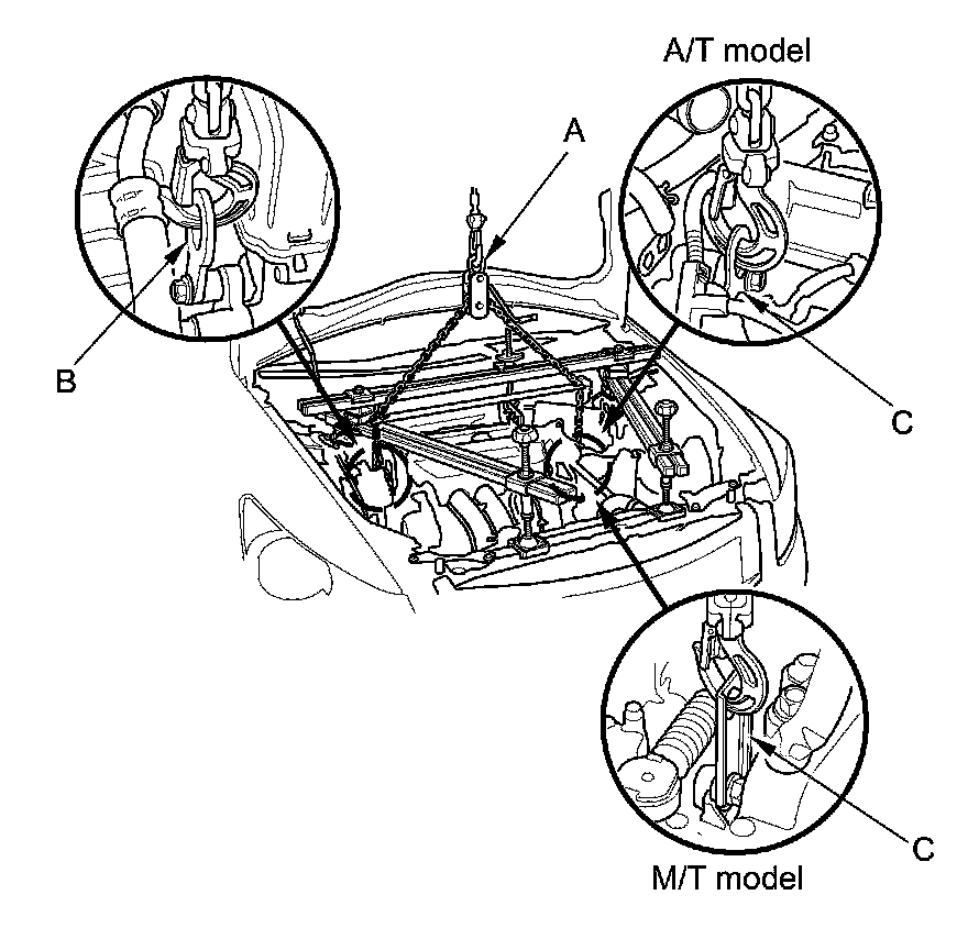 60. Attach a chain hoist (A) to the universal lifting eyelet (B) and the transmission hanger (C), then lift the engine/ transmission until it is securely supported by the chain hoist, and remove the engine support hanger and the engine hanger adapter.