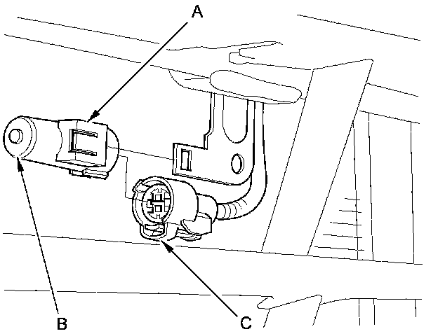 1. Lift the tab (A) to release the lock, then remove the outside air temperature sensor (B) from the front bumper beam. Disconnect the 2P connector (C) from the outside air temperature sensor.