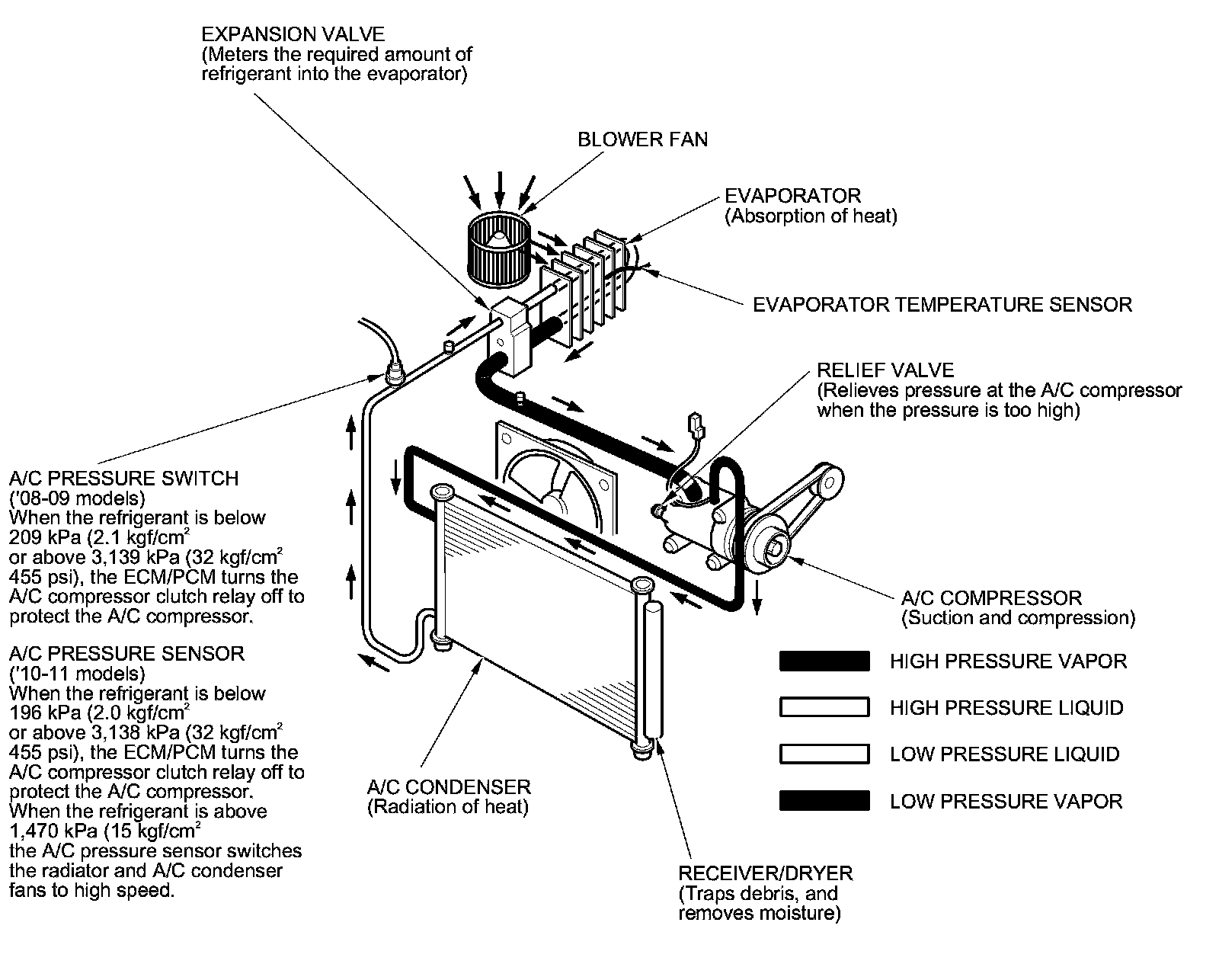 NOTE: When the refrigerant is below 196 kPa (2.0 kgf/cm2, 28 psi) or above 3,138 kPa (32 kgf/cm2, 455 psi), the ECM/PCM turns the A/C compressor clutch relay off to protect the A/C compressor. When the refrigerant pressure is above 1,470 kPa (15.0 kgf/cm2, 213 psi), the ECM/PCM switches the radiator and A/C condenser fans to high speed.