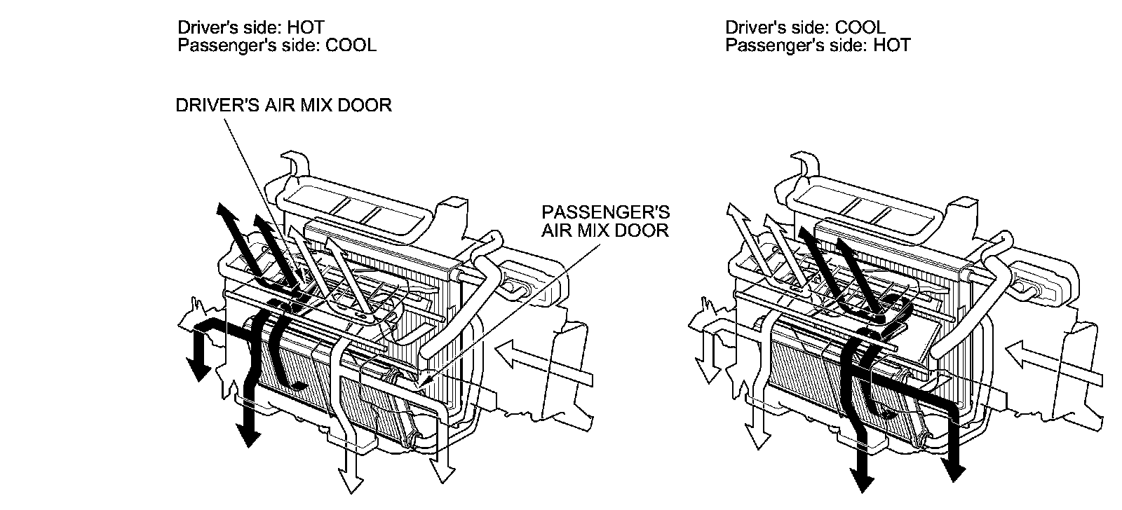 This system automatically controls the temperature and the vent mode of the air direction to the driver and passenger's side depending on the angle of the sun and the direction of the vehicle. It calculates information such as date, time, longitude, and latitude from the navigation system, as well as the radiant strength of the sun from the sunlight sensor, to determine the appropriate mode position and temperature to be directed to each side.