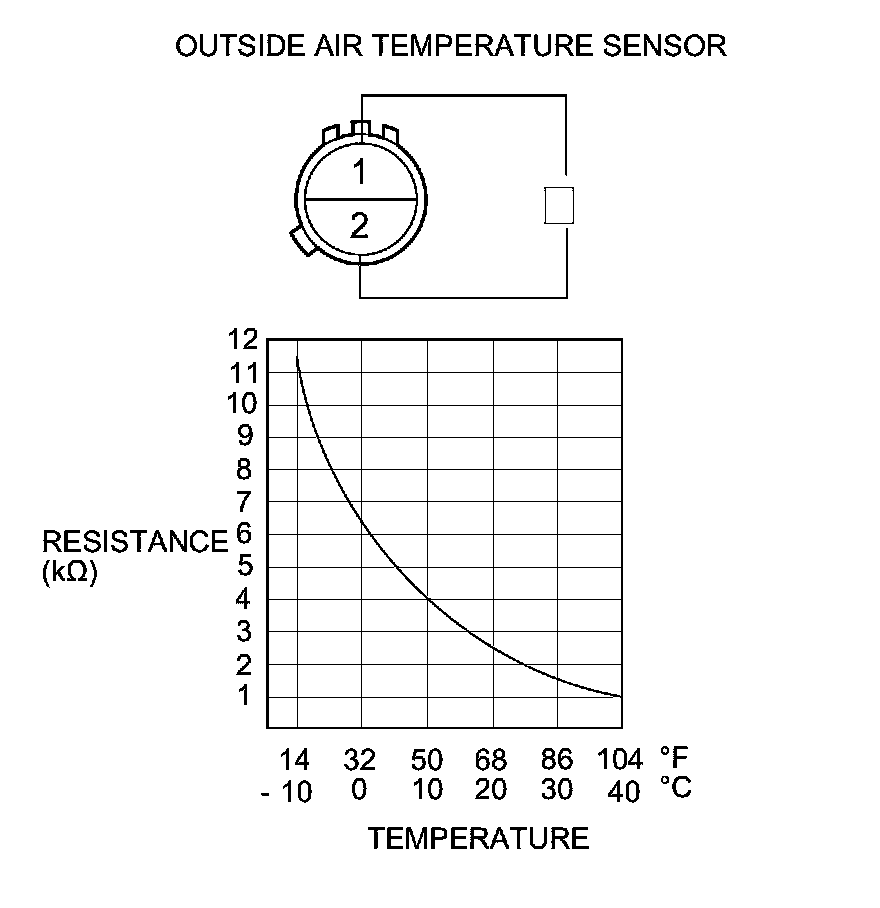 3. Compare the resistance reading between terminals No. 1 and No. 2 of the outside air temperature sensor with the specifications shown in the graph; the resistance should be within the specifications.