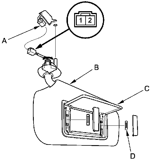 4. If the continuity is not as specified, check the bulbs (D). If the bulbs are OK the vanity mirror light is faulty; replace the sunvisor Service and Repair.