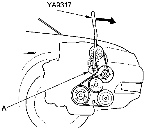 1. Move the auto-tensioner (A) using the belt tension release tool in the direction of the rotation arrow to relieve tension from the drive belt, then remove the drive belt.