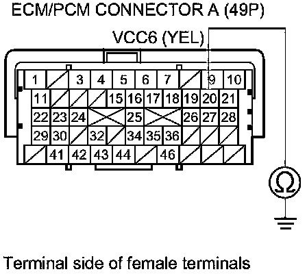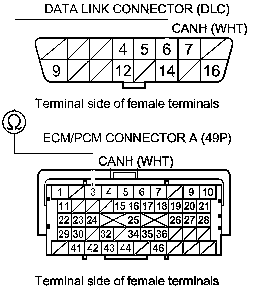 30. Check for continuity between ECM/PCM connector terminal A3 and DLC terminal No.6.