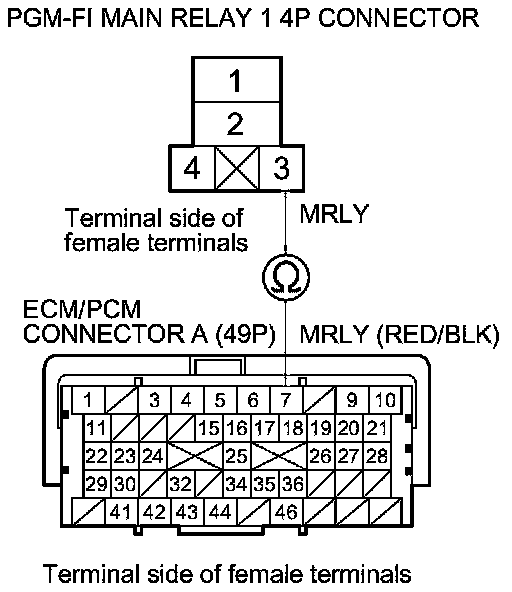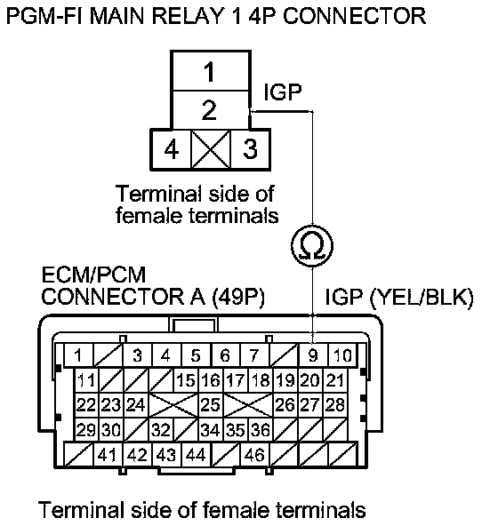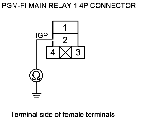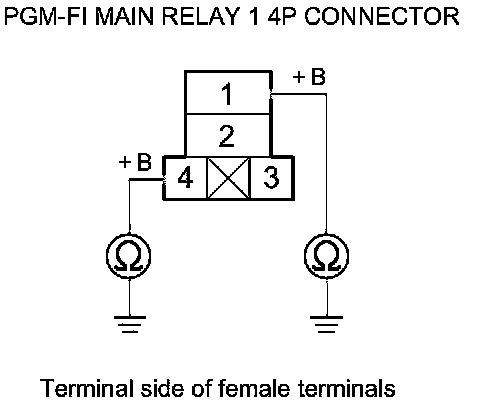 38. Check for continuity between body ground and PGM-FI main relay 1 4P connector terminals No. 1 and No. 4 individually.
