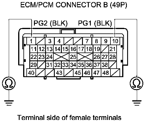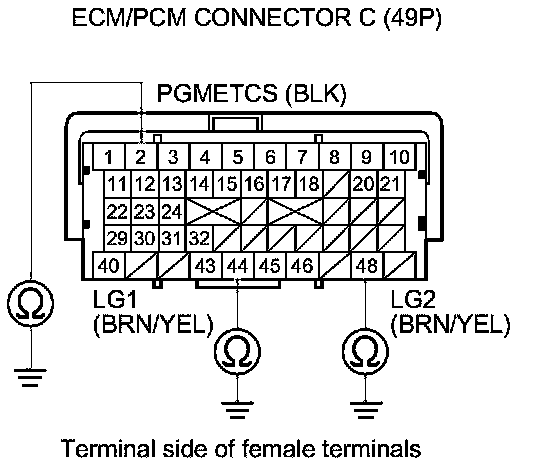 49. Check for continuity between ECM/PCM connector terminal C10 and body ground.