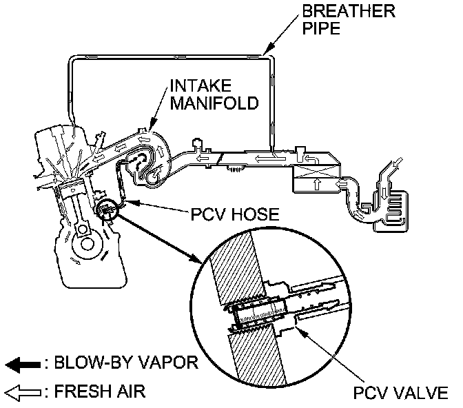 The PCV valve prevents blow-by gasses from escaping into the atmosphere by venting them into the intake manifold.