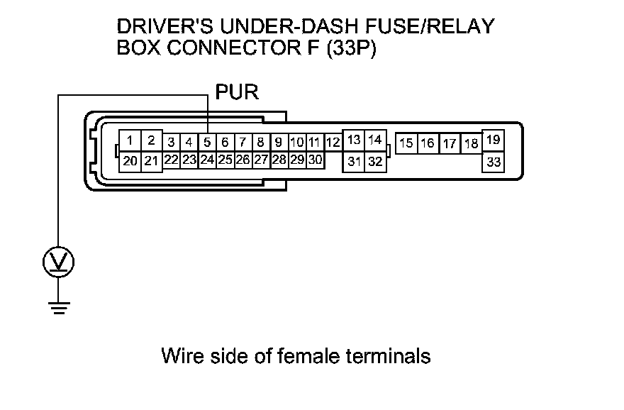 7. Measure the voltage between driver's under-dash fuse/relay box connector F (33P) terminal No. 5 and body ground.