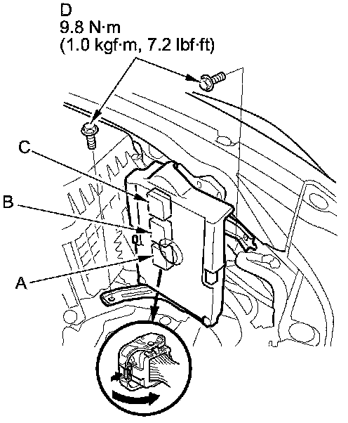 10. Disconnect ECM/PCM connectors A, B, and C, then remove the ECM/PCM assembly (E).
