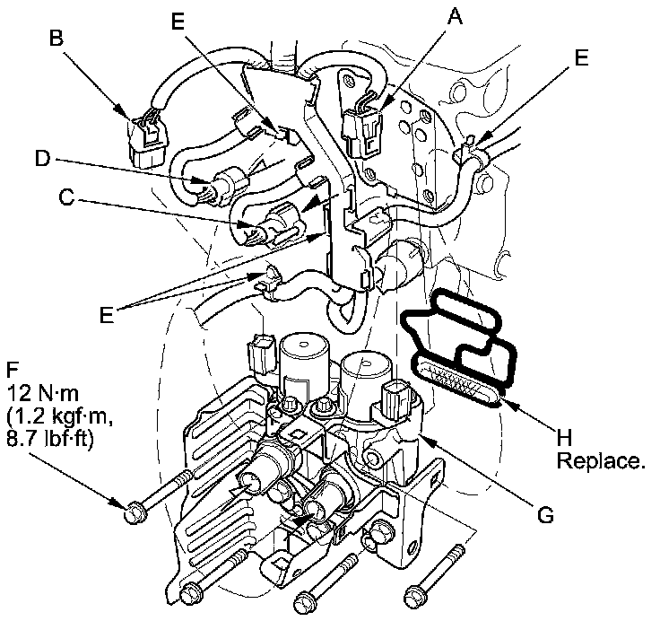 4. Remove the rocker arm oil control valve assembly (G) and the rocker arm oil control valve filter (H).