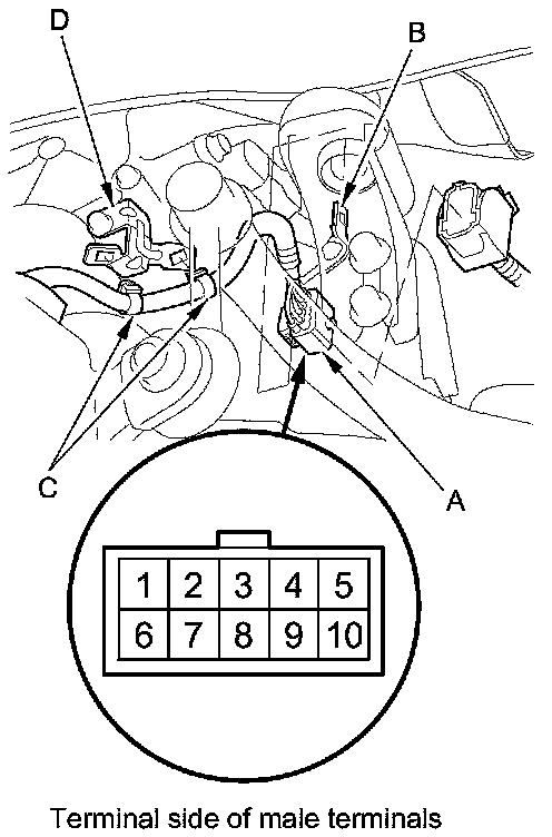 4. Remove the harness clamps (C) from the clamp bracket (D).