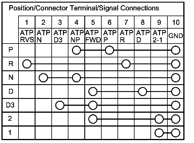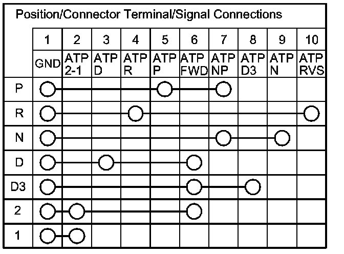 9. Check for continuity between the terminals at the transmission range switch connector. There should be continuity between the terminals in the following table for each shift lever position.